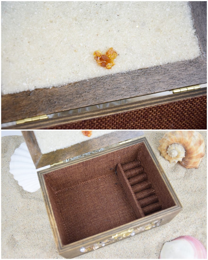 Na spodzie pokrywy znajduje się drobny piasek, na którym ułożone zostało serce stworzone z prawdziwych polskich bursztynów – subtelny i symboliczny akcent dodający całości wyjątkowego uroku. Szkatułka została osadzona na korkowych stopkach, które chronią powierzchnię mebli i zapewniają stabilność.