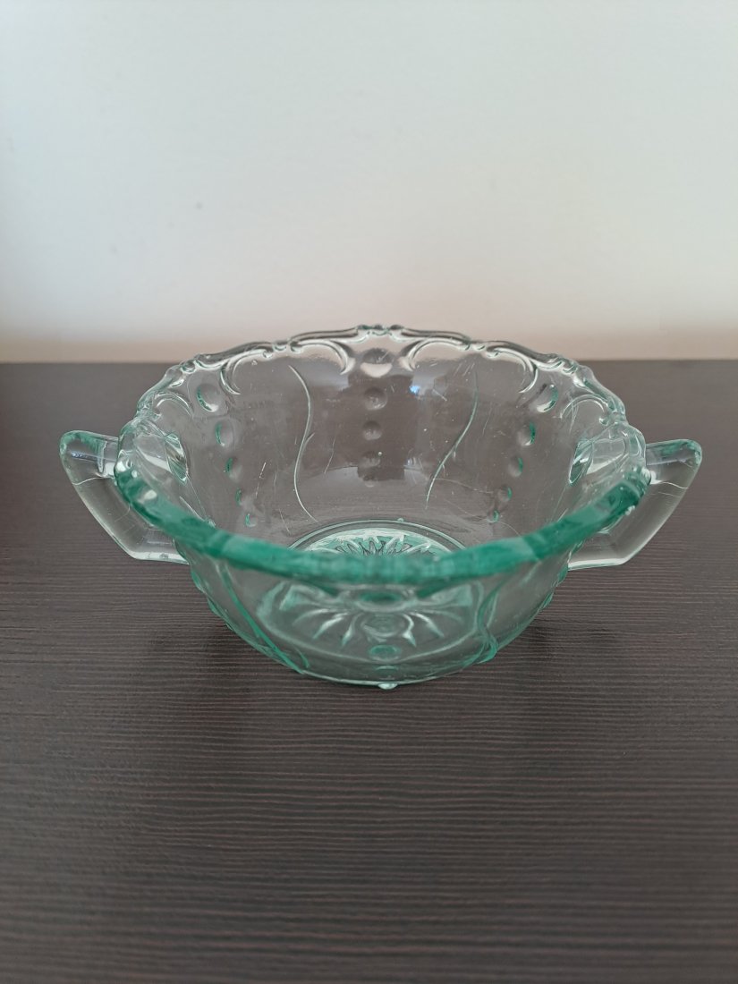 Szklana cukierniczka w pięknym zielonym kolorze. Szkło prasowane, lata 40, 50 dwudziestego wieku. Wyprodukowana przez hutę szkła Johansfors, stan dobry.