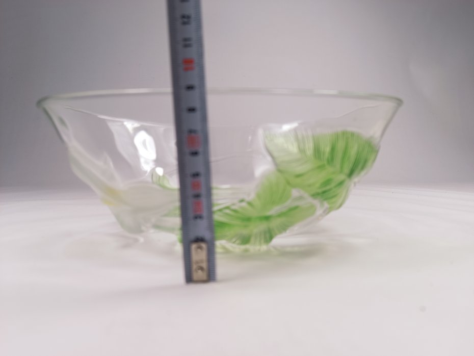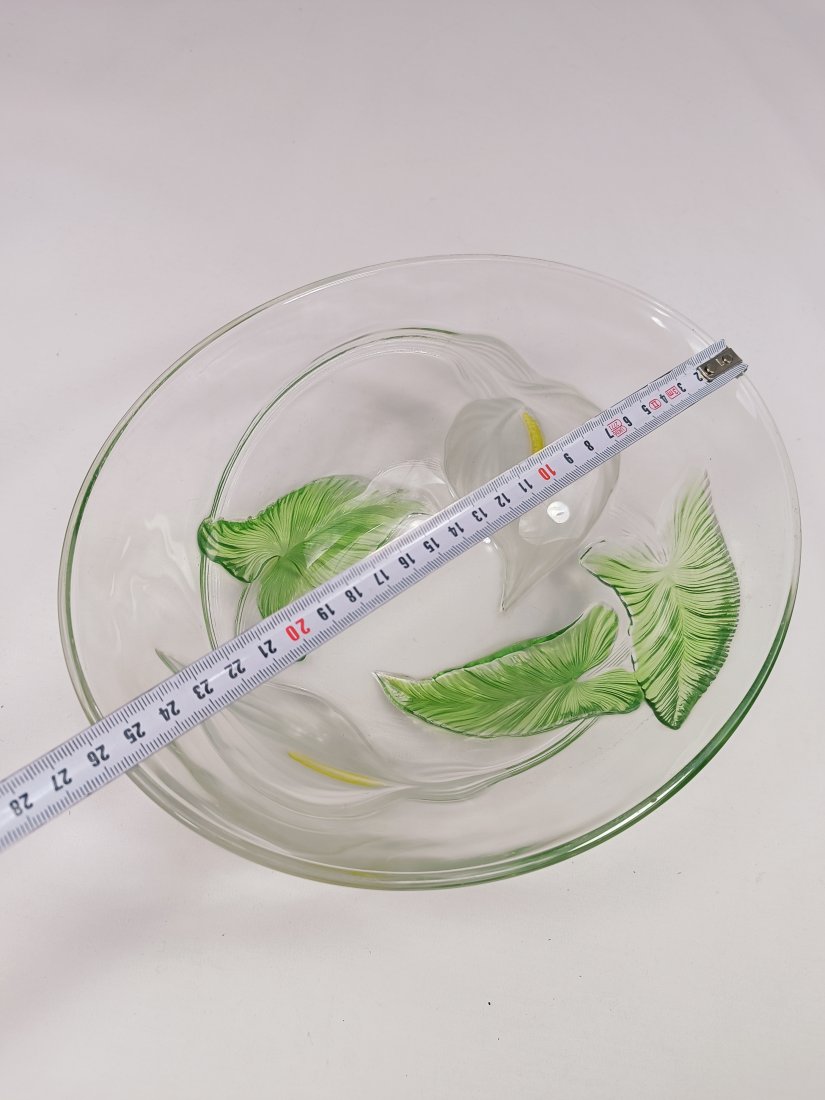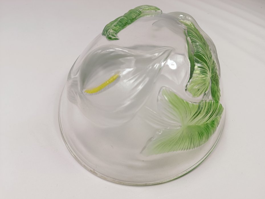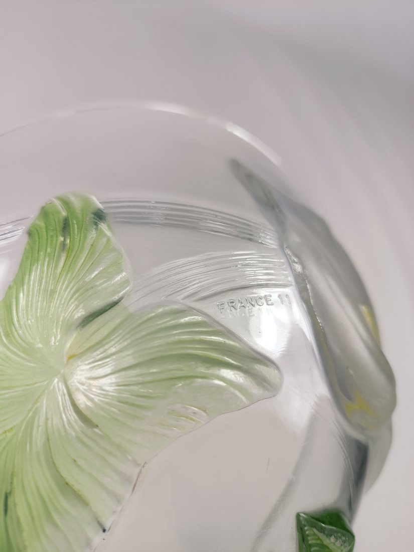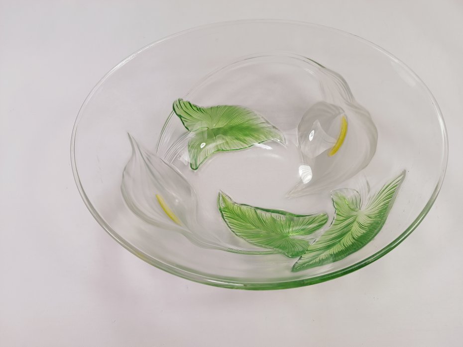 Szklana misa w ozdobny wzór kwiatowy w kalie, wyprodukowana we Francji. Stan zachowania bardzo dobry bez uszkodzeń.