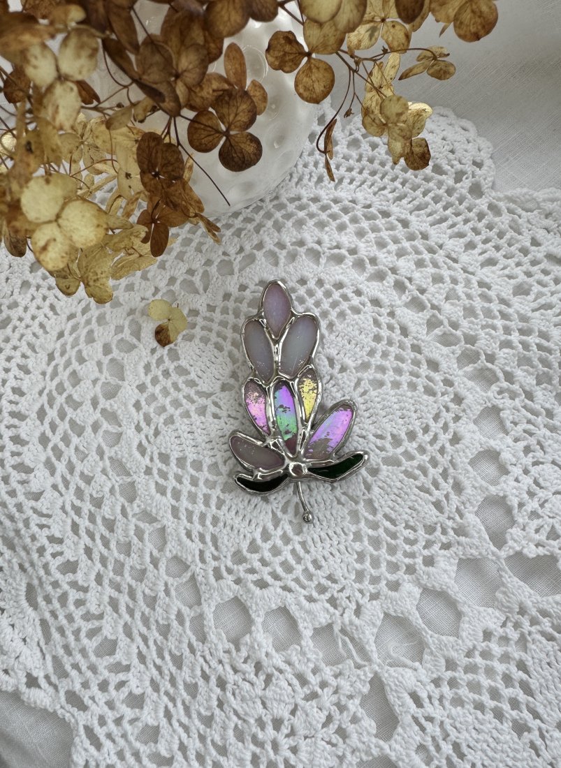 Broszka wykonana z opalizującego różowego szkła w technice Tiffany.