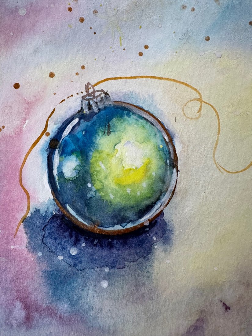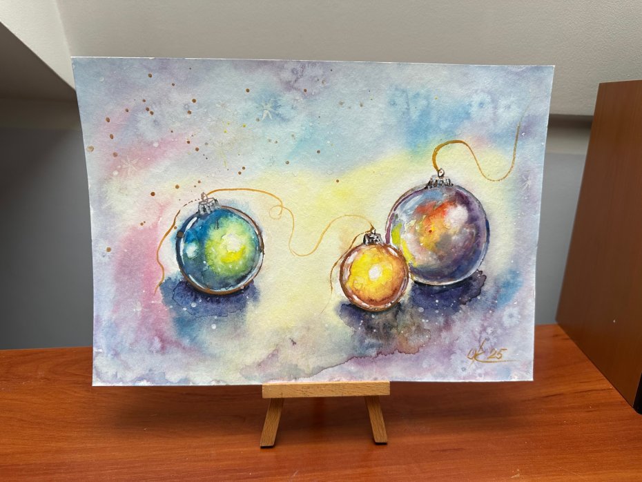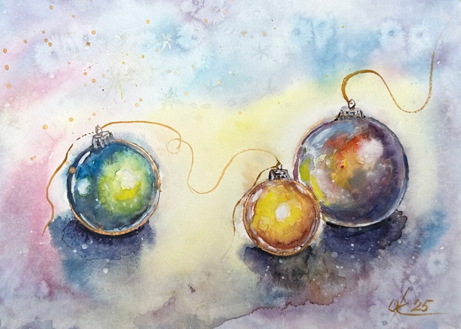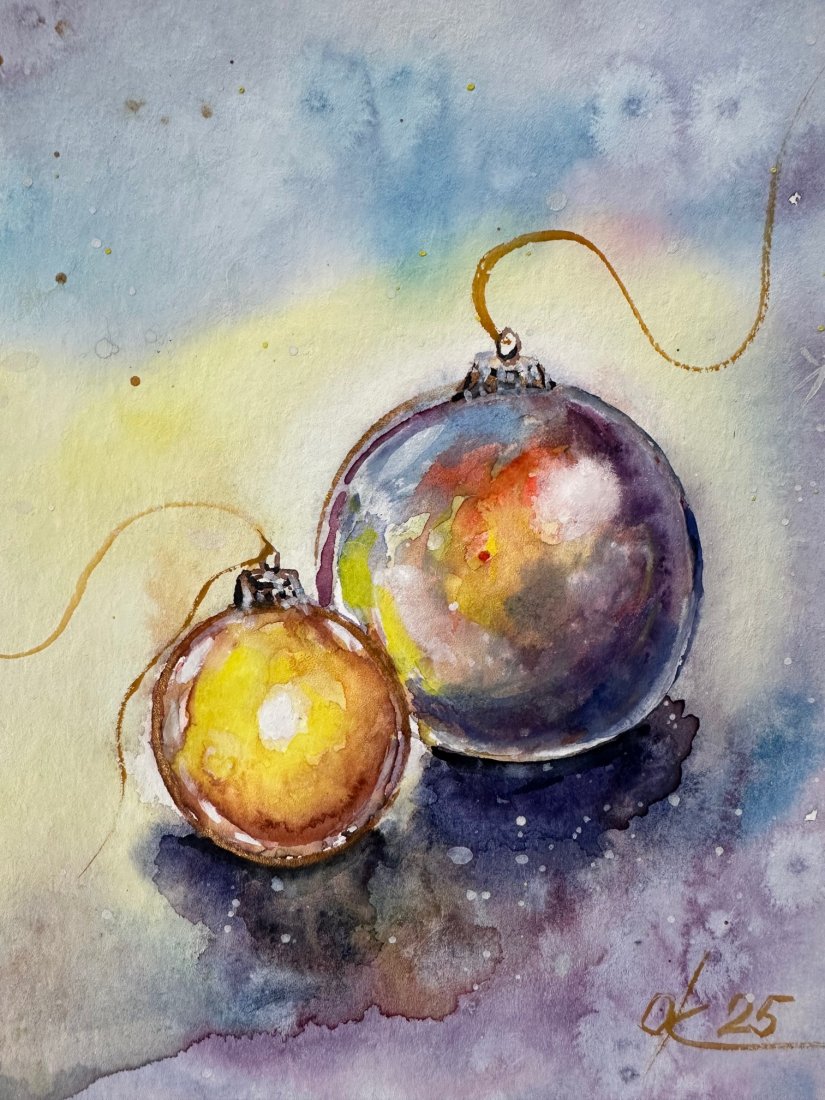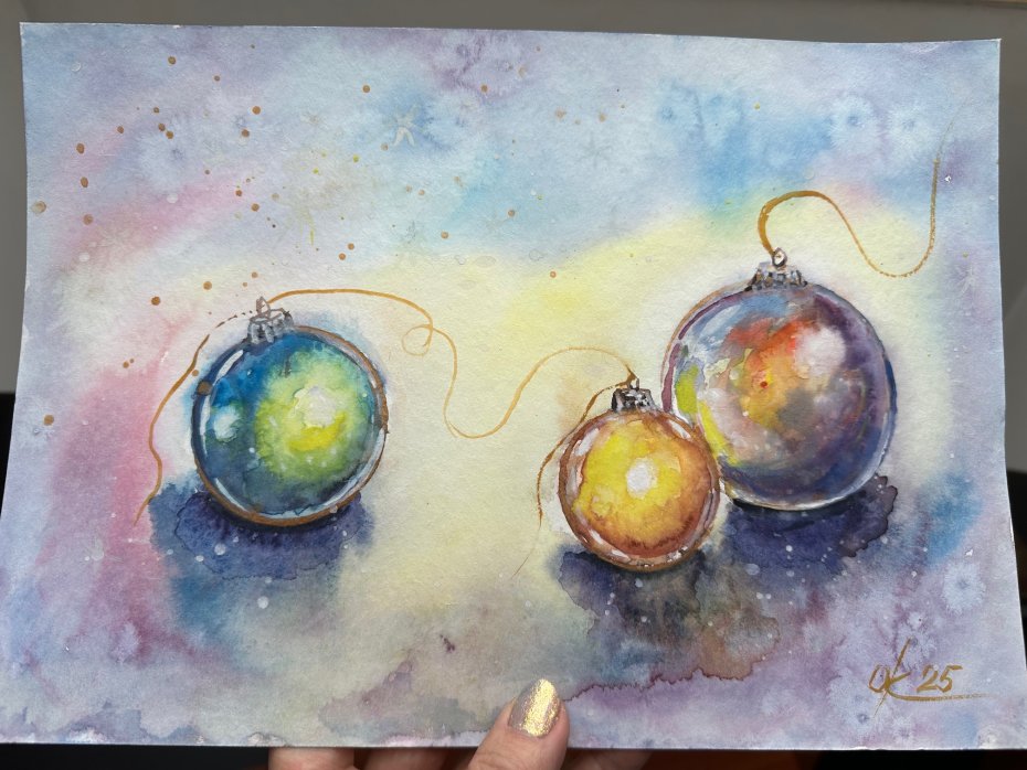 Zabawki noworoczne originalna akwareli A4 ręcznie malowana.