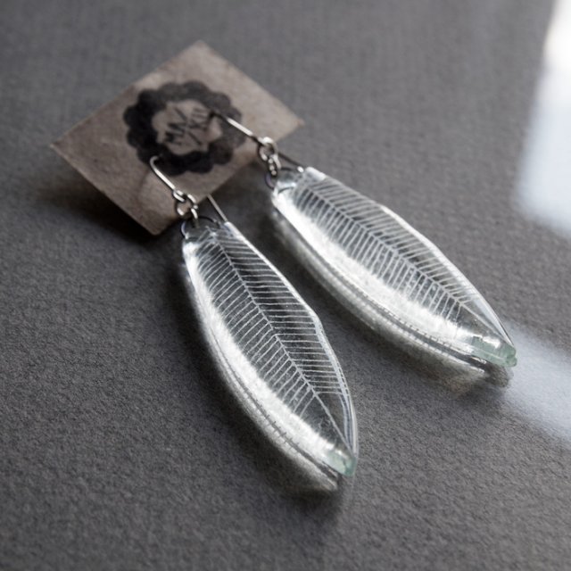 Piękne kolczyki wykonane metodą fusingu ze szkła bezbarwnego. Na powierzchni widnieje delikatny wzór pióra, który został starannie wygrawerowany w szkle.