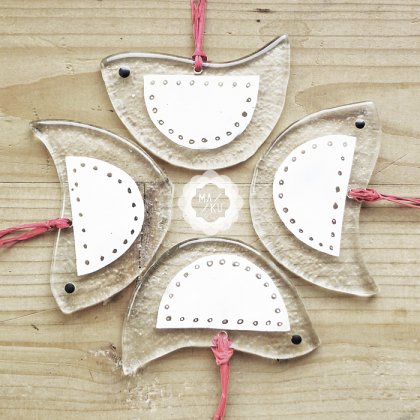 Zestaw czterech świątecznych zawieszek na choinkę wykonanych ze szkła metodą fusingu. Elementy wykonane ze szkła bezbarwnego z ręcznie malowanym i wypalanym wzorem na powierzchni. Spód szkła posiada delikatną fakturę ciekawie odbijającą światło.