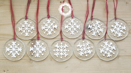 Zestaw dziesięciu świątecznych zawieszek na choinkę wykonanych ze szkła metodą fusingu. Elementy wykonane ze szkła bezbarwnego z ręcznie malowanym i wypalanym wzorem na powierzchni. Spód szkła posiada delikatną fakturę ciekawie odbijającą światło.