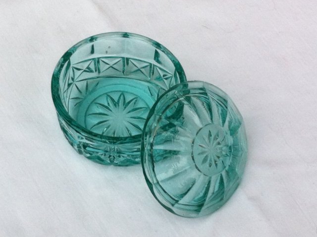 Pięknej barwy szlachetnie szklane puzderko, ozdobnie ryte, dekoracyjne i efektowne, na poetycko eleganckie... ach! jeszcze raz : ten Kolor ! :) Na kosmetyczne lub biżuteryjne skarby... 6,5 x 5,5 cm. Stan zachowania bardzo dobry.