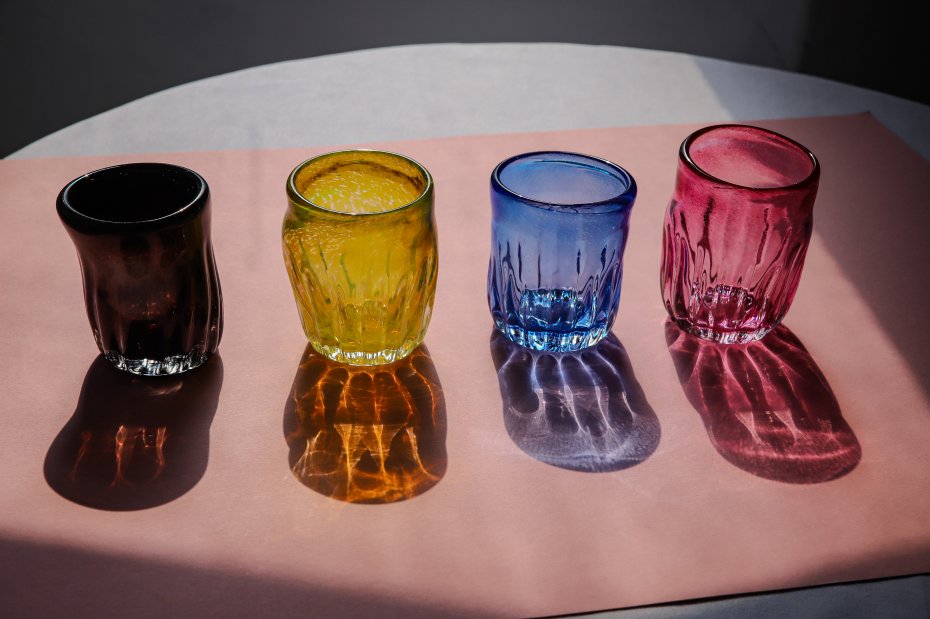 Szklanka "Optyk" powstała w wyniku wykorzystania metalowej przedformy dawniej używanej przez hutników do produkcji szkła w technice zwanej optyk. Wykorzystując pierwszy etap tej popularnej techniki uzyskałem fakturę szkła która w kolejnym etapie została podgrzana. W tym procesie każda kolejna szklanka jest nieco inna od następnej. Do barwienia masy użyłem kolorowej fryty szklanej.