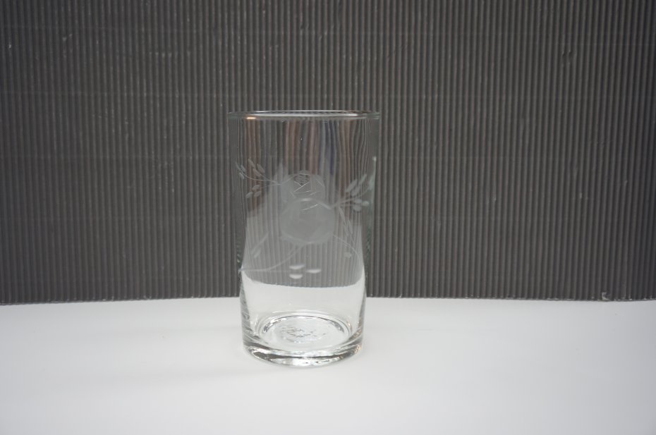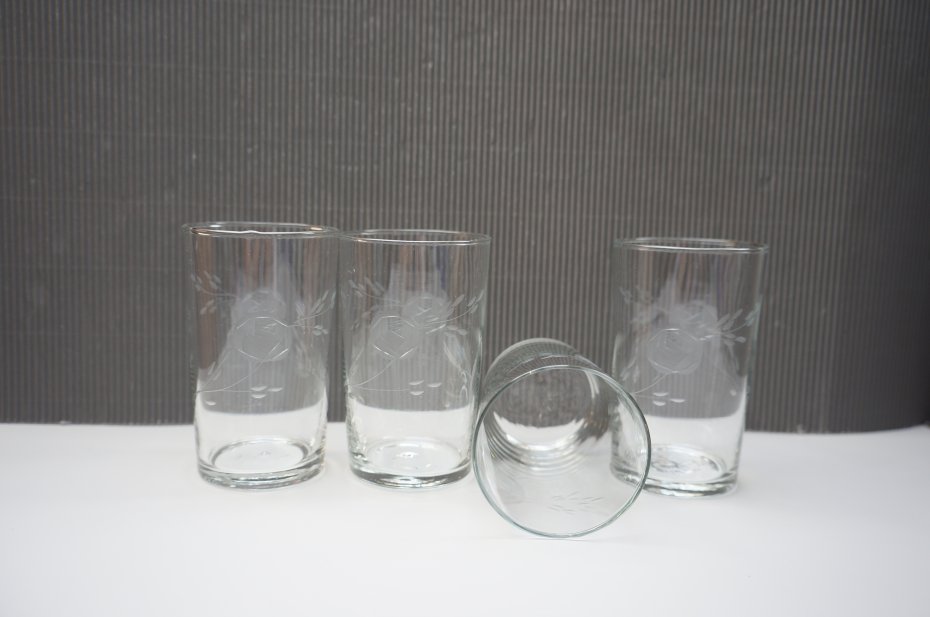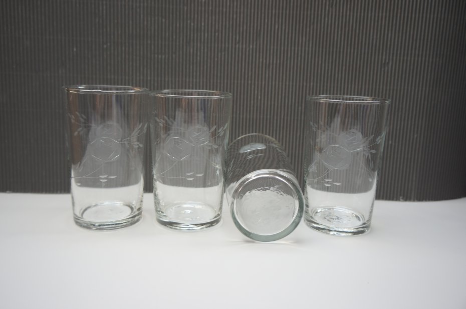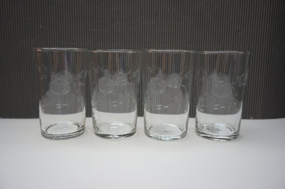 Zestaw 4 szklanek z delikatnego szkła. Ozdobione wzorem kwiatowym, szlifowanym na szkle. Pochodzą z lat 80 ubiegłego wieku. Stan bardzo dobry.