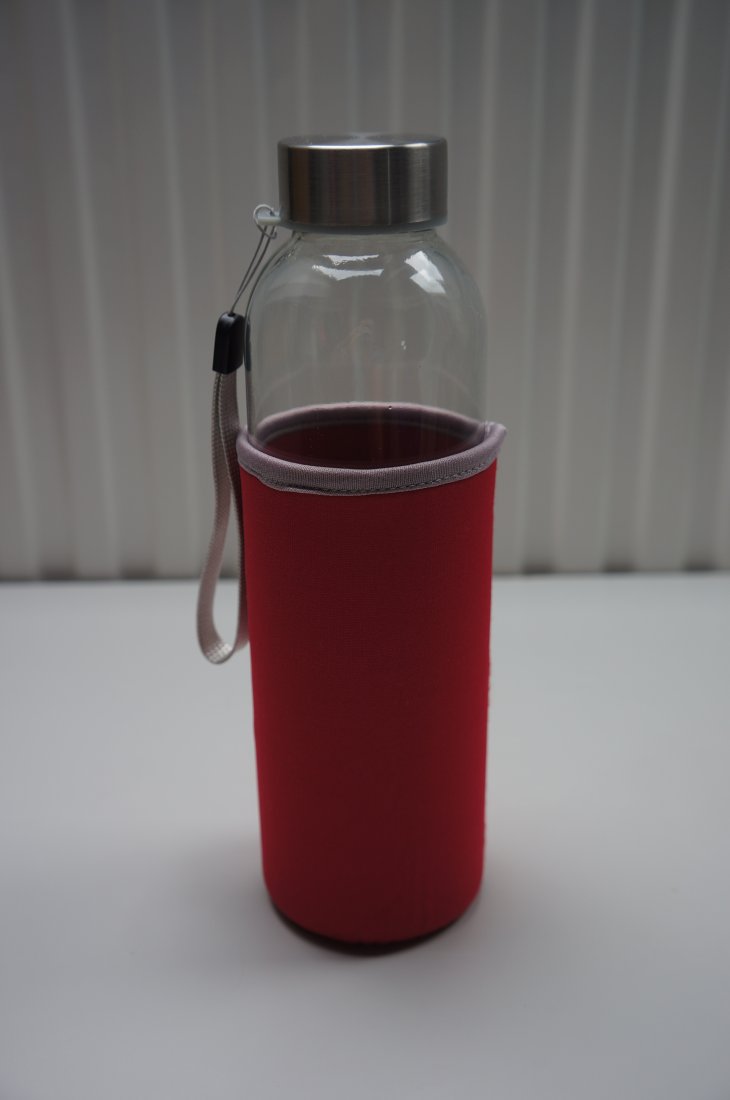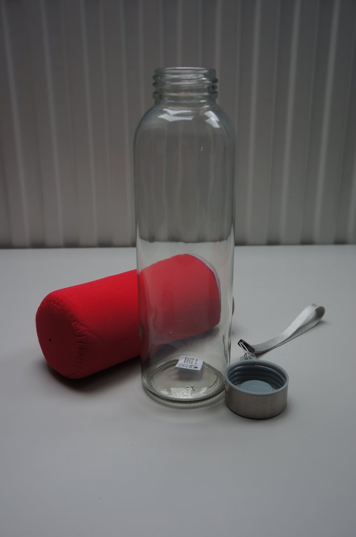 Szklana butelka z jednowarstwową ścianką i zakrętką. Zakrętka posiada pasek do łatwego przenoszenia. Butelkę osłania neoprenowe etui, zapewniające dodatkową ochronę oraz izolację termiczną. Zalecana do zimnych napojów. Nie zamrażać, nie używać w kuchence mikrofalowej. Szkło grube. Butelka zapakowana w kartonowe pudełko. Nowa. Stan bardzo dobry.