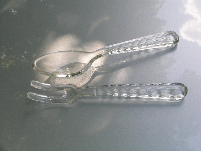 Para sztućców sałatkowych z grubego przezroczystego szkła. Wyjątkowe..... Praktyczne, bo nie super delikatne, rączki ryflowane. Ciekawe proporcje. 21,5 x 5 x 3,5 cm. Stan zachowania dobry - bez uszczerbków i większych wad - drobne ślady użytkowania.