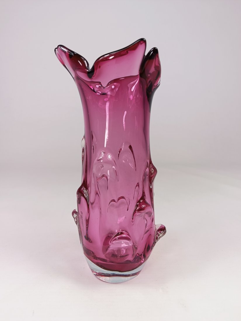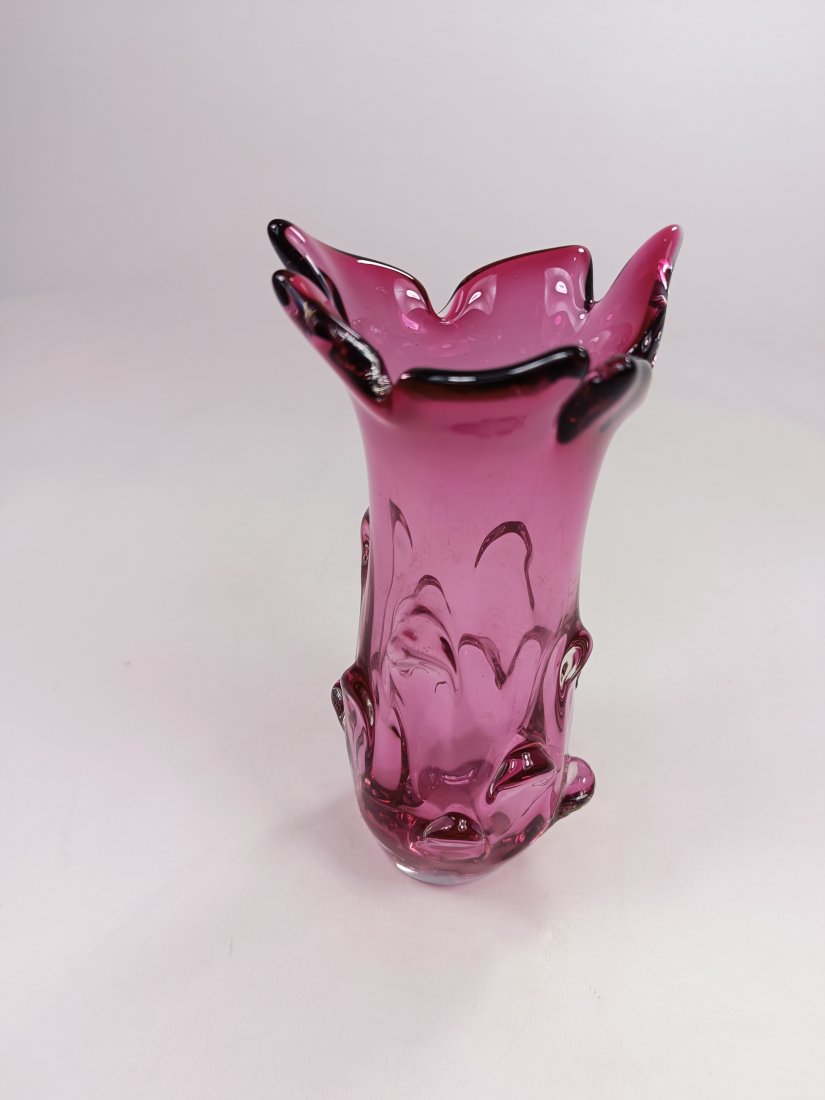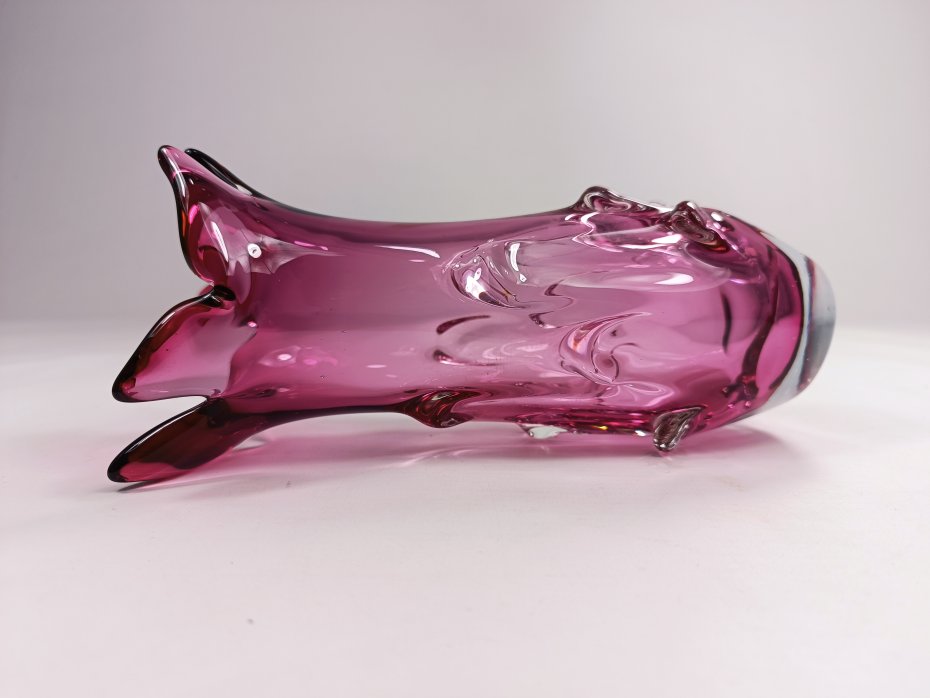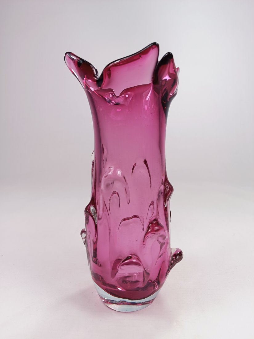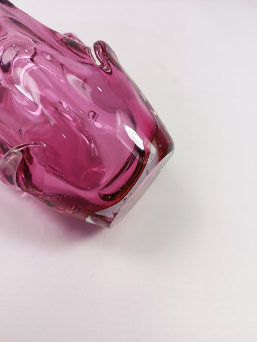 Szklany wazon w kolorze różowym z Czechosłowacji. Stan zachowania bardzo dobry. Jedynie przy podstawie występują drobne obicia pokazane na ostatnich zdjęciach. Wysokość 20 cm, szerokość 11 cm.