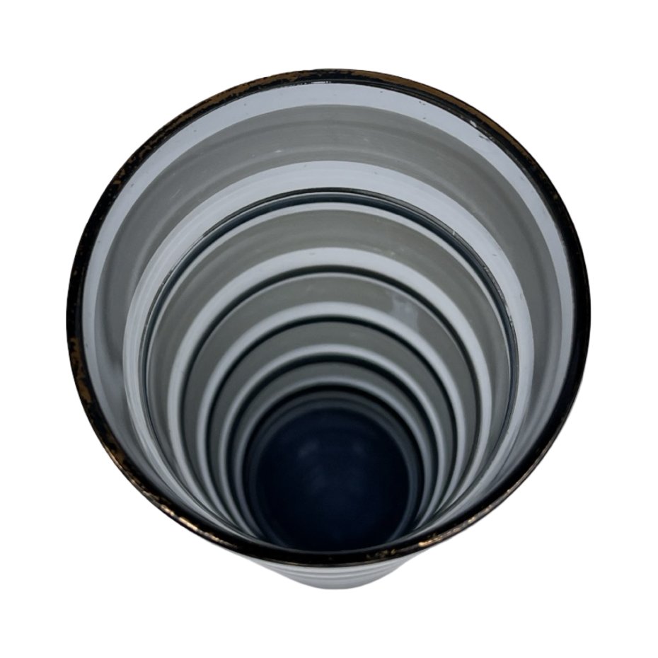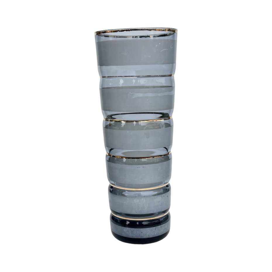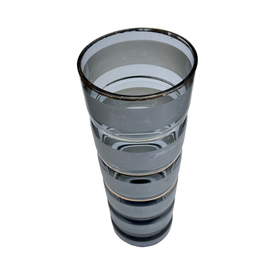 Elegancki, cylindryczny wazon wykonany ze szkła dymionego, dekorowany poziomymi pasami ze złotą obwódką. Charakterystyczne profilowanie szkła nadaje mu rytmiczną, niemal architektoniczną formę, typową dla europejskiego szkła użytkowego z przełomu lat 60. i 70. XX wieku. Klasyczna kolorystyka dymionego szkła w połączeniu ze złotem tworzy ponadczasowy, dekoracyjny efekt.