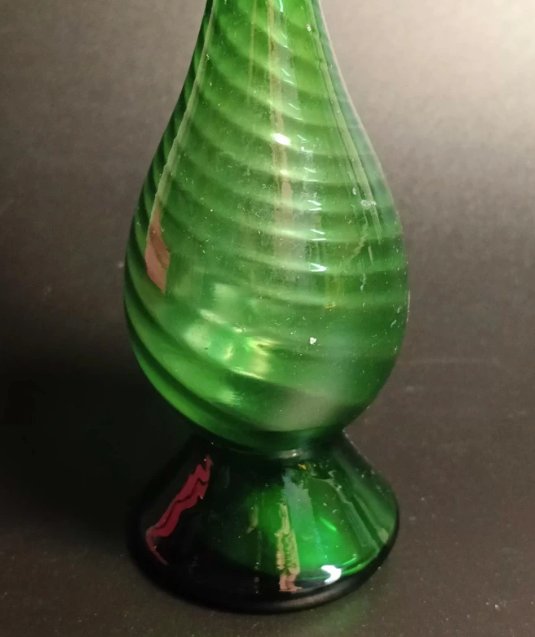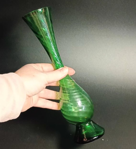 Ciekawy wazon szklany w zielonym kolorze.