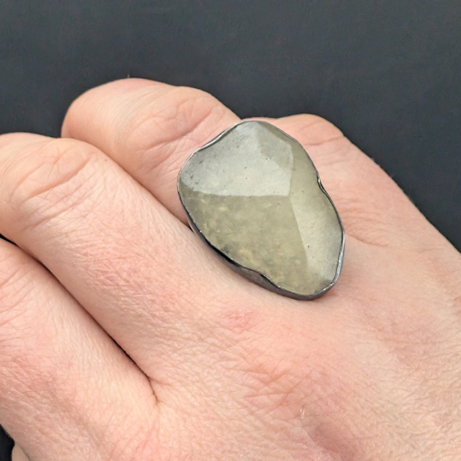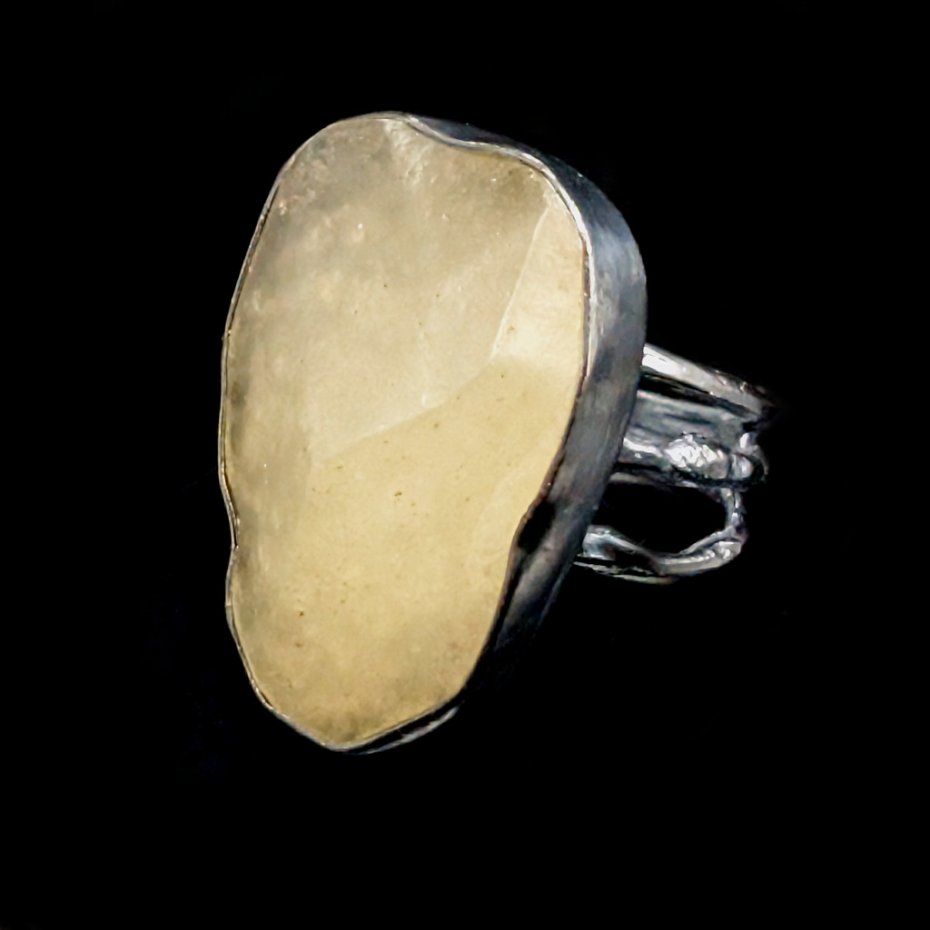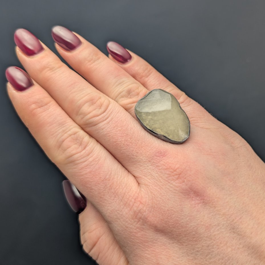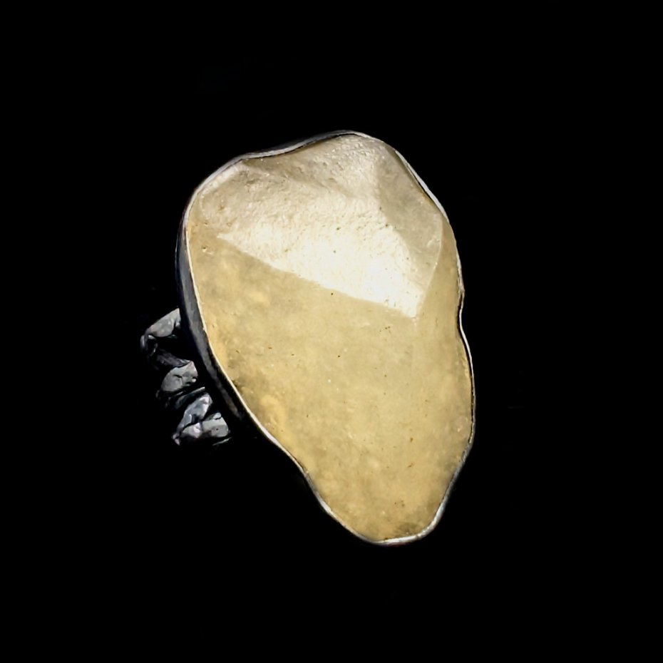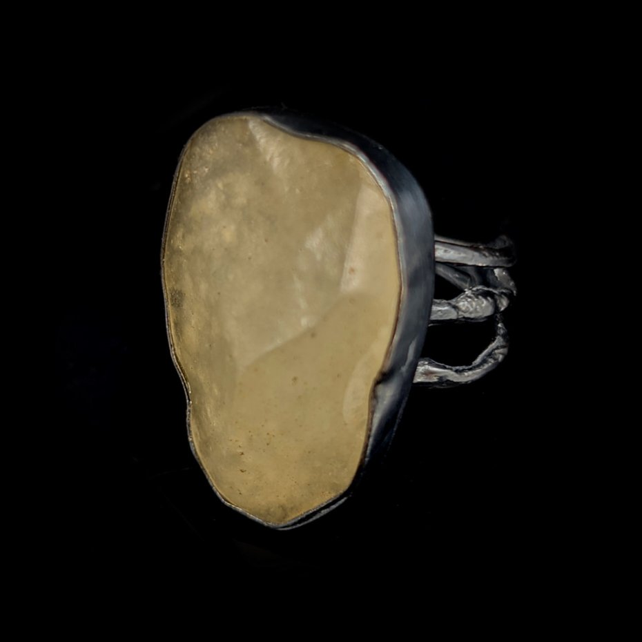 Pierścień, który zdobi piękny, surowy okaz unikalnego szkła libijskiego. Klasyczna oprawa oksydowanego srebra próby 925. Waga 9,4 g. Wymiary całej oprawy 27 x 20 mm. Rozmiar jubilerski 13, mogę powięszyć na max 14. Proszę napisać na jaki dopasować. Pierścień zapakowany zostanie w ozdobne pudełeczko.