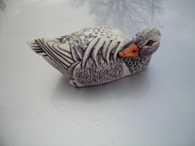 Ręcznie wykonana rzezba z masy kamiennej / domniemam - bo ciężka,ale jak na kamień...hmmm.../. Sygnowana HO i napis GARGANEJ - Cyranka. Piękna robota, precyzyjna. Ręcznie malowanie...Cudo dekoracyjne,co i przyciskiem do papieru być może ze względu na ciężar. Ecru, antracytowa czerń i soczysty pomarańcz. Wykończenie gładkie,satynowe. Tylko dziób i oczy nieco bardziej błyszczące. Od spodu podklejona czarnym materiałem. Fantastyczna na szczęśćie, do kolekcji i na prezent ;)