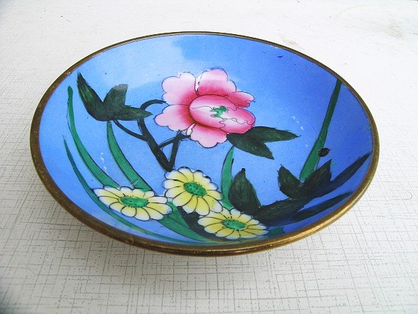 Oryginalna miska dekoracyjna, sygnowane chińskie rękodzieło. Forma podstawowa porcelanowa, z wierzchu emalia, wszystko w zewnętrznej mosiężnej oprawie. Barwnie żywe zdobienie kwiatowe. Z tyłu haczyk do powieszenia. Nie tylko ozdobna ale i użytkowa. Średnica 15; głębokość 4 cm. W dwóch miejscach delikatne przetarcia smugi - stan bardzo dobry.