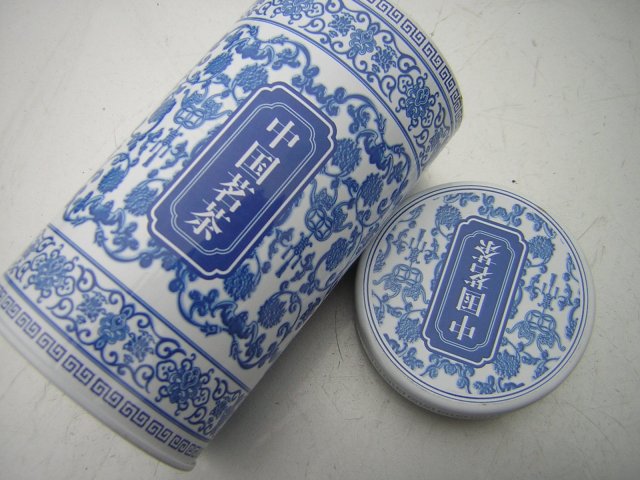 Oryginalna puszka na herbatę. Dół 6,5 góra 6,5 wys. 12,5 cm Wyjątkowo porządnie wykonana i ciekawie zdobiona. Eleganckie połączenie bieli i niebieskości w wykończeniu satynowo - błyszczącym. Zdobienie zaś. ..połączenie wzorów wielce oryginalne. ..Niespotykane i do japońskich klimatów wielce pasujące. ..Bardzo porządna gruba przykrywką, wewnątrz złota. Stan zachowania bardzo dobry minus. Niewielkie ślady użytkowania.