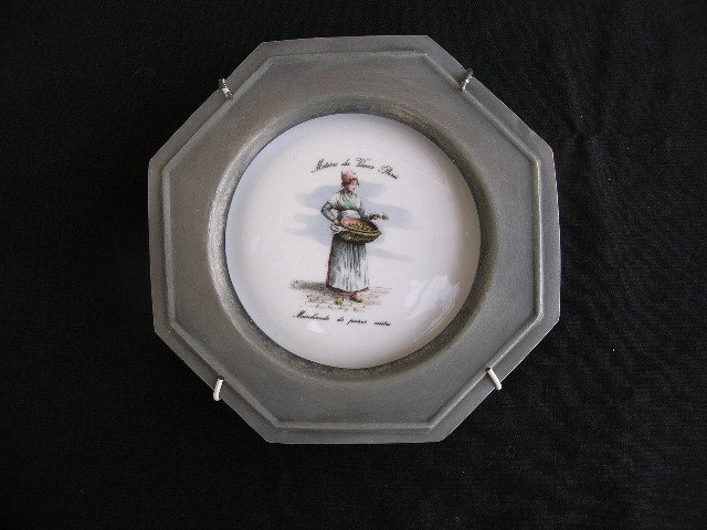 Ciekawy obrazek z porcelanowego talerza w cynowej stylizowanej ramce. Sygnowany Chauvigny France. Malatura z nostalgicznym przedstawieniem dawnych paryskich sprzedawców - tutaj: kobieta z gotowanymi gruszkami. Biel solidnej a szlachetnej porcelany. Z tyłu profesjonalny uchwyt do powieszenia. 15,5 x 3,5 cm. Stan zachowania bardzo dobry.