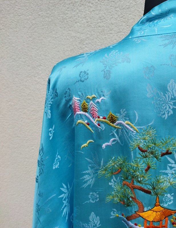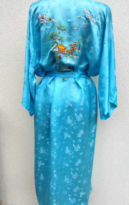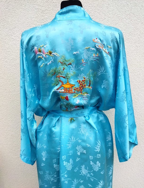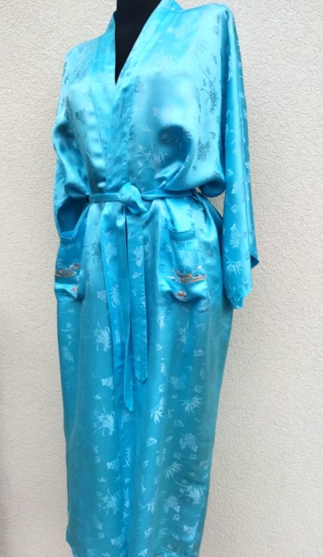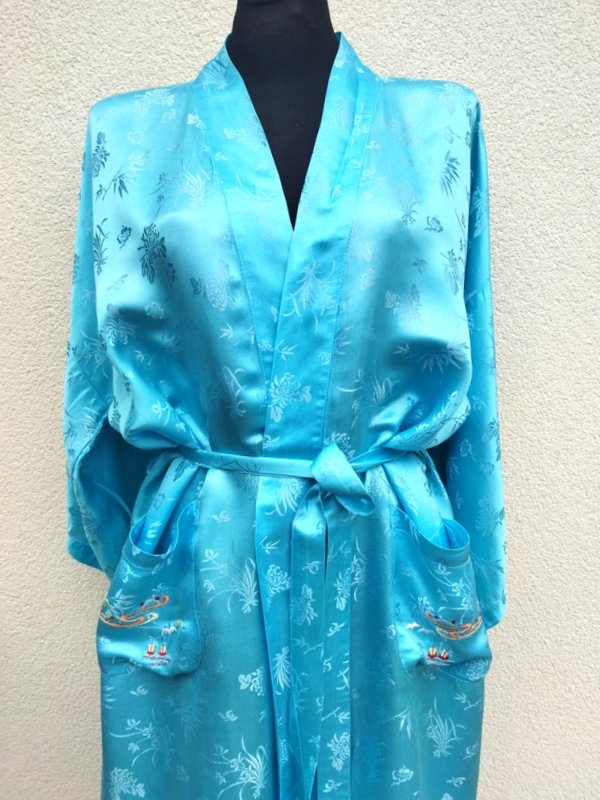 Piękny kimonowy szlafrok z przemiłej tkaniny z rayonu i jedwabiu w błękitnym kolorze z żakardowym wzorem miejscowo zdobionym haftami z japońskimi motywami. fason otwarty z dwiema naszywanymi kieszeniami, wiązany paskiem w talii