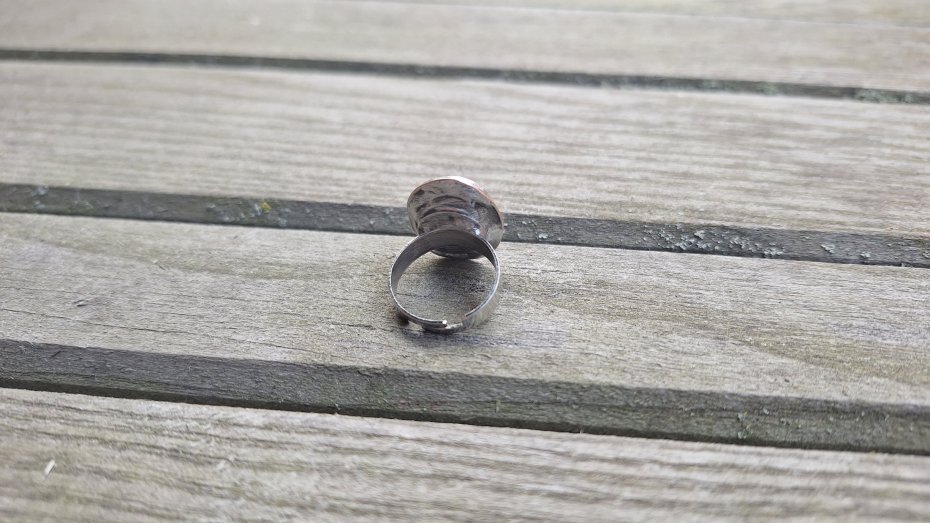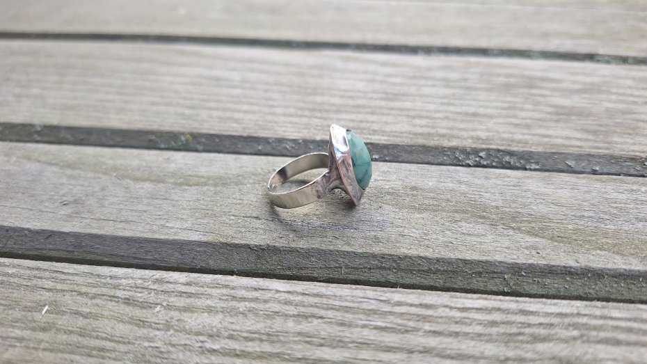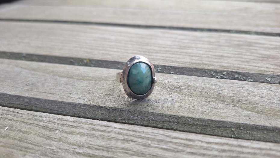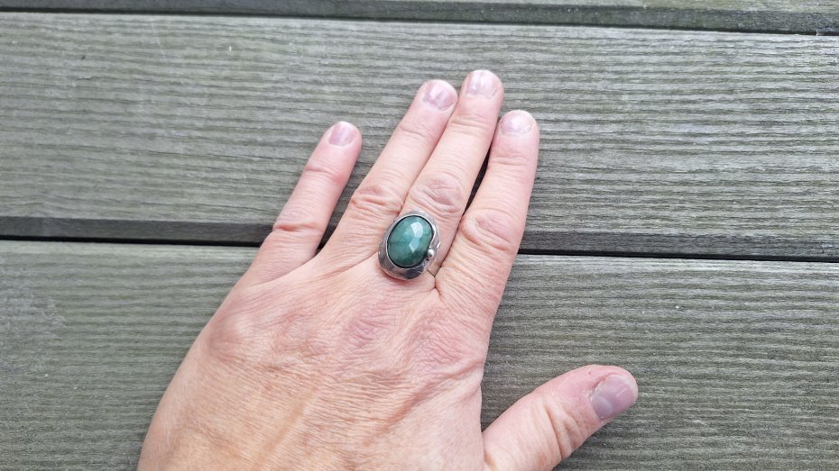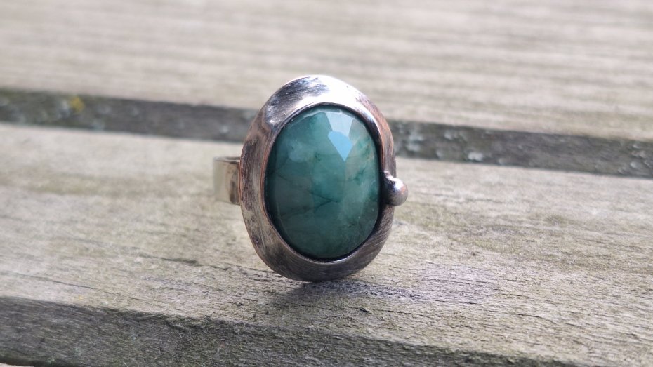 Pierścionek wykonany z miedzi, cyny i fasetowanego szmaragdu. Wymiary ok. 2 na 1.5 cm. Regulowany. Nie jest ciężki.