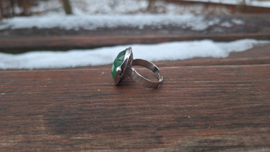 Pierścionek wykonany z miedzi, cyny i fasetowanego szmaragdu. Wymiary ok. 2 na 1.5 cm. Regulowany. Nie jest ciężki.