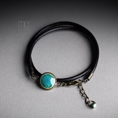 Efektowna bransoletka wykonana z rzemienia jubilerskiego w kolorze brązowym, elementów w kolorze starego złota i ręcznie wykonanej ceramicznej zawieszki, szkliwionej mieszanką zielonych szkliw z efektem plamek o subtelnym połysku, Obwód regulowany. Polecam