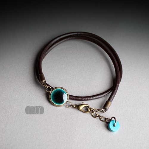 Efektowna bransoletka wykonana z rzemienia jubilerskiego w kolorze brązowym, elementów w kolorze starego złota i ręcznie wykonanej ceramicznej zawieszki, szkliwionej mieszanką zielonych szkliw z efektem plamek o subtelnym połysku, Obwód regulowany. Polecam