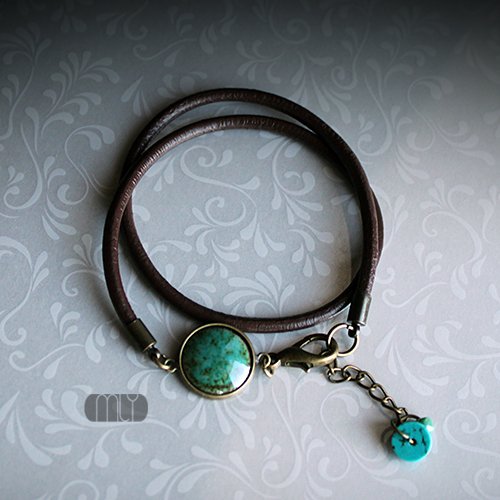 Efektowna bransoletka wykonana z rzemienia jubilerskiego w kolorze brązowym, elementów w kolorze starego złota i ręcznie wykonanej ceramicznej zawieszki, szkliwionej mieszanką zielonych szkliw z efektem plamek o subtelnym połysku, Obwód regulowany. Polecam