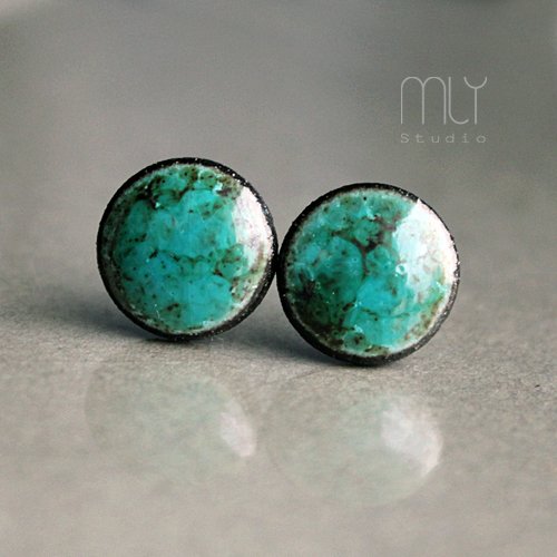 Ceramiczne, lekko nieregularne kolczyki w formie sztyftów, ręcznie wykonane z delikatnej czekoladowobrązowej gliny kamionkowej, jednostronnie szkliwione efektownym turkusowym błyszczącym szkliwem z efektem plamek, na sztyftach w kolorze srebrnym.Średnica ok. 11mm. Polecam