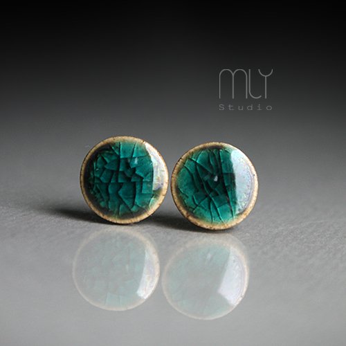 Ceramiczne lekko nieregularne kolczyki w formie sztyftów, ręcznie wykonane z delikatnej gliny kamionkowej, jednostronnie szkliwione mieszanką zielonych szkliw o pięknym efektownym połysku ( kolor szkliwa może się nieco różnić w zależności od ustawień monitora), na antyalergicznych sztyftach w kolorze srebrnym. Średnica ok. 11mm. Polecam