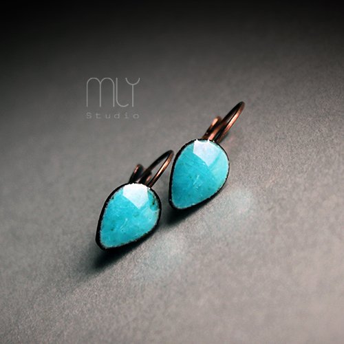 Podłużne ceramiczne kolczyki, ręcznie wykonane z delikatnej gliny kamionkowej, szkliwione mieszanką szmaragdowozielonego szkliwa z efektem plamek, na zamkniętych biglach w kolorze miedzi. Średnica elementu ceramicznego ok. 13mm, długość bigla ok 19mm. Polecam