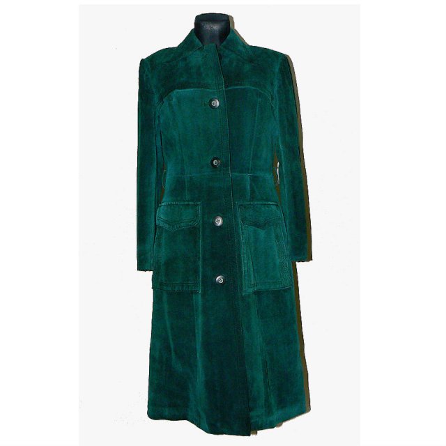 Cudowny płaszcz z naturalnej zamszowej skóry, w przepięknym intensywnym odcieniu szmaragdowej zieleni. Luksusowa szwedzka marka Induyco.