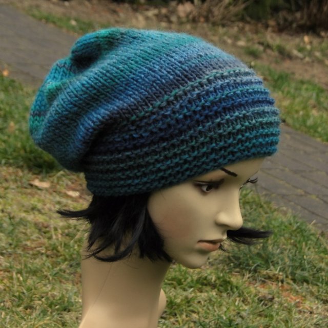Ciepła, mięsista czapa wykonana ręcznie na drutach z hiszpańskiej włoczki w pięknym zestawieniu kolorystycznym (50% wełna, 50% akryl), przyjemna w dotyku. Czapka jest bezszwowa, dwustronna.
