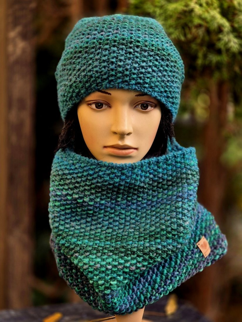 Ciepły, miękki ( wykonany niezbyt luźno, aby nie hulał po nim wiatr :) ) i przyjemny w dotyku komplet wykonany ręcznie na drutach z rewelacyjnej włóczki prod. hiszpańskiej ( 53% wool, 47% akryl)