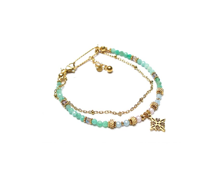 Delikatna bransoletka wykonana w całości ze stali szlachetnej pozłacanej, szlachetnych kamieni - szmaragdy fasetowane [2,5mm], kwarc dymny platerowany [2,5mm], akwamaryn fasetowany [2,5mm], cyrkonie fasetowane [2,5mm], hematyt fasetowany platerowany [2mm], przekładek z hematytu [1mm]. Całkowita długość bransoletki 18,5cm. Biżuteria ozdobnie zapakowana.