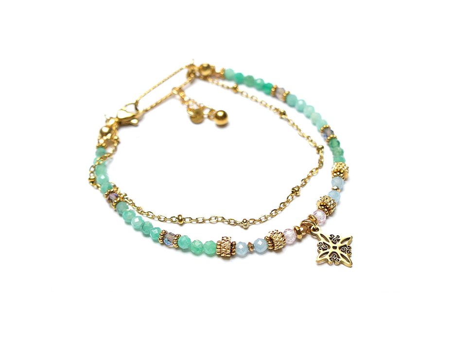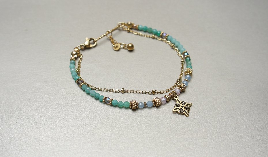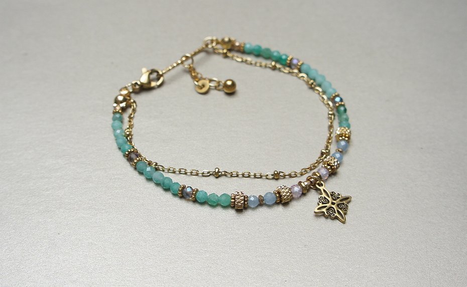 Delikatna bransoletka wykonana w całości ze stali szlachetnej pozłacanej, szlachetnych kamieni - szmaragdy fasetowane [2,5mm], kwarc dymny platerowany [2,5mm], akwamaryn fasetowany [2,5mm], cyrkonie fasetowane [2,5mm], hematyt fasetowany platerowany [2mm], przekładek z hematytu [1mm]. Całkowita długość bransoletki 18,5cm. Biżuteria ozdobnie zapakowana.