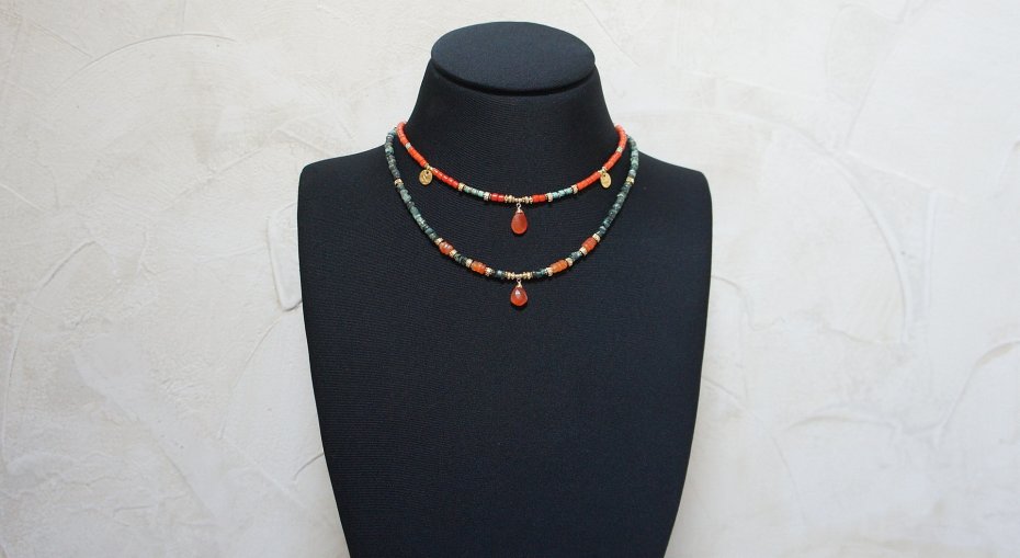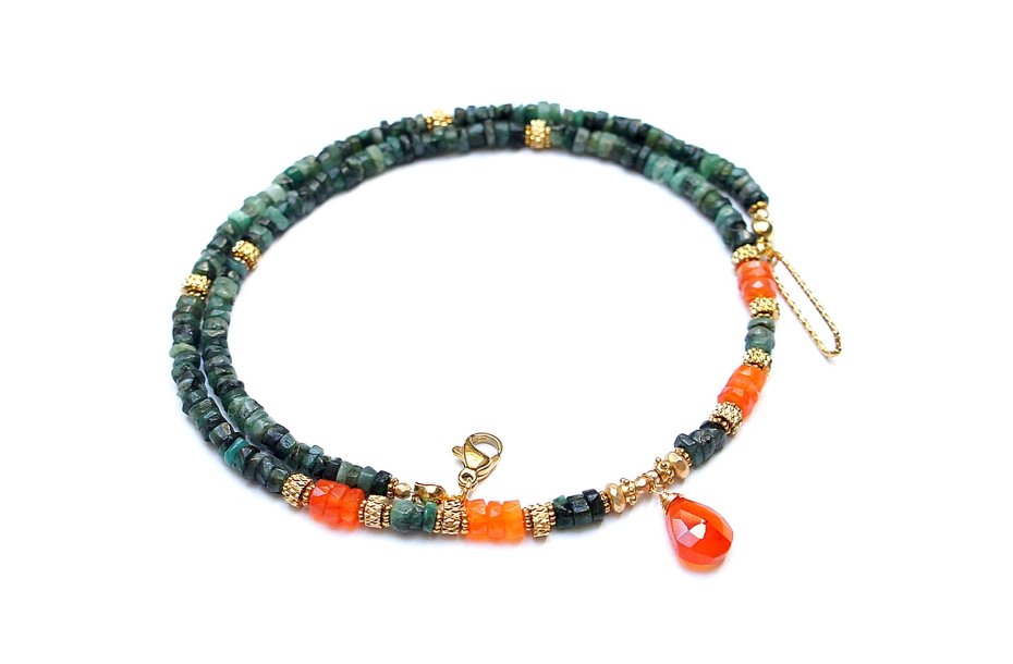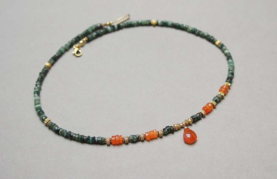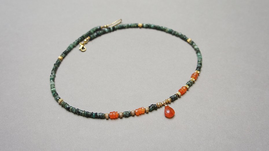 Krótki naszyjnik wykonany w całości z pozłacanej stali szlachetnej oraz szlachetnych kamieni - talarki nieregularne szmaragdów [1-2 x 4mm, talarki nieregularne karneolu [ok. 4 x 2mm], hematytu fasetowanego, platerowanego [3x2mm, 2mm] oraz zawieszki z karneolu [brioletka fasetowana]. Naszyjnik o długości ok. 45cm. Pojedynczy egzemplarz.