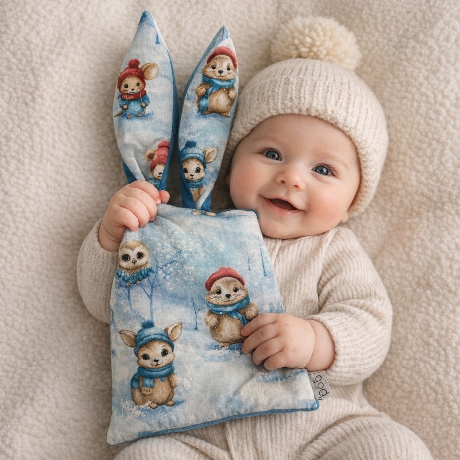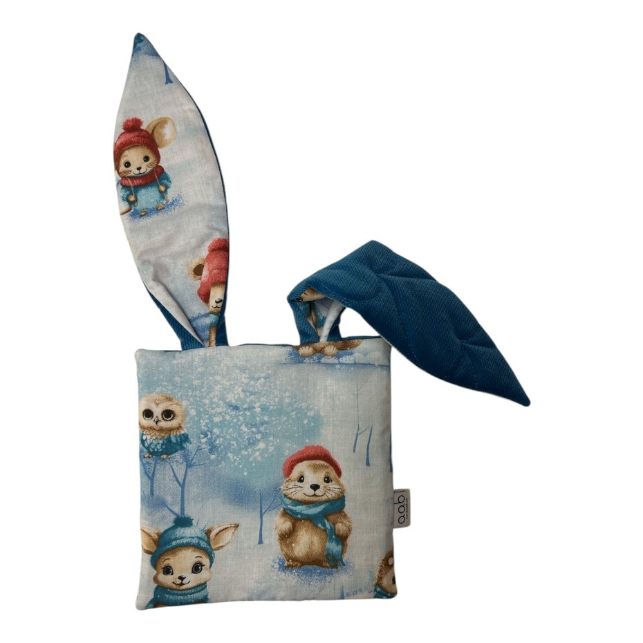 Uszyte z najwyższej jakości, bezpiecznych tkanin: 100 % bawełny i pikowanego velvetu, w środku szeleszcząca folia stymulująca sensorycznie .Długie uszy i kolory z pewnością pobudzą zmysły Maluszka.