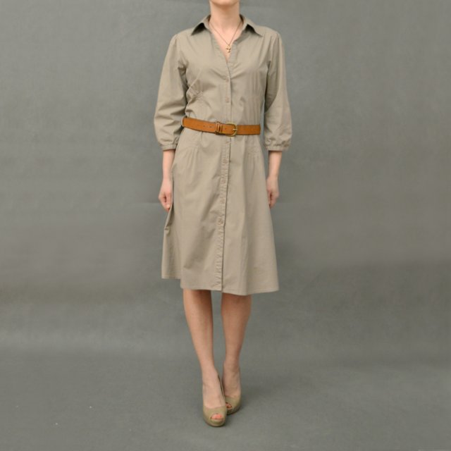 Beżowa szmizjerka marki POPIN.W talii szlufki na pasek - pasek nie jest w komplecie. Rękawy do łokcia.