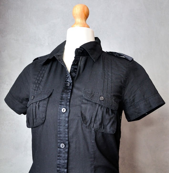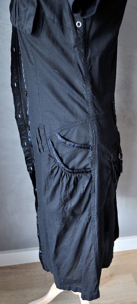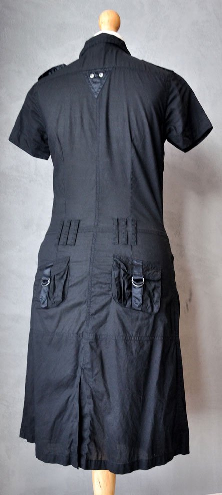 Casualowa, lekko rozszerzająca się ku dołowi sukienka cargo w militarnym stylu. Ma sporo przeszyć, kieszonek, sprzączek i dżetów.