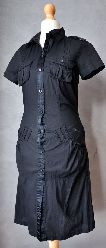 Casualowa, lekko rozszerzająca się ku dołowi sukienka cargo w militarnym stylu. Ma sporo przeszyć, kieszonek, sprzączek i dżetów.