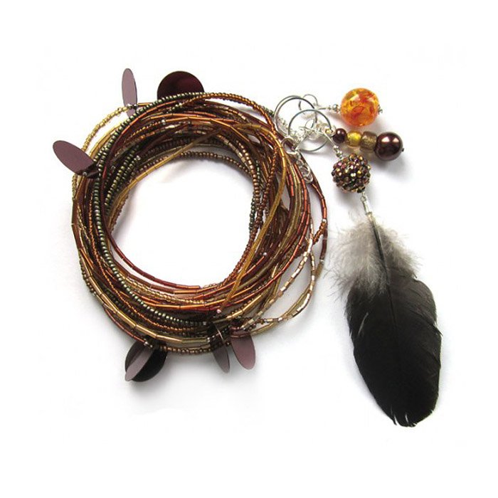 Piękny, długi sznur z koralików drobnych, rurek, dużych cekinów i szkła. Dodatkową ozdobą są trzy zawieszki, które można zdejmować (szkło, perełki, akryl, ozdobny koralik z naturalnym piórkiem). Zapięcie i wykończenie w kolorze srebrnym. Sznur można nosić także jako bransoletkę. Całkowita długość to około: 510 cm!