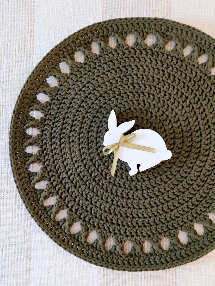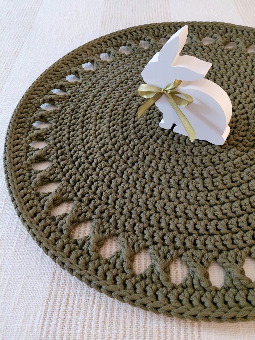 Piękna sznurkowa serweta z akcentem ażurowym średnicy 58cm wykonana ręcznie z bawełnianego sznurka w kolorze awokado według mojego autorskiego projektu.