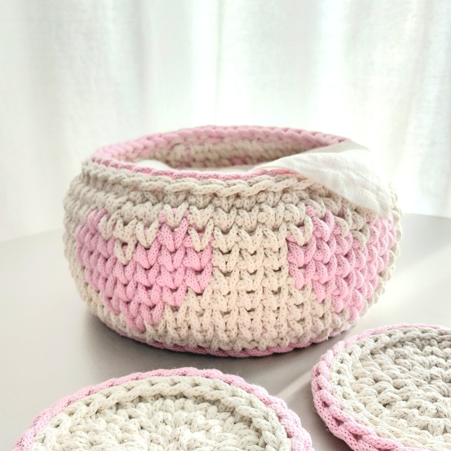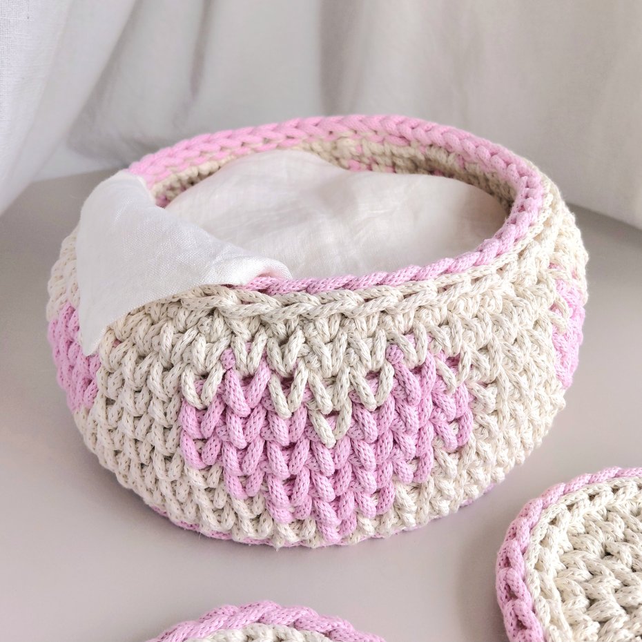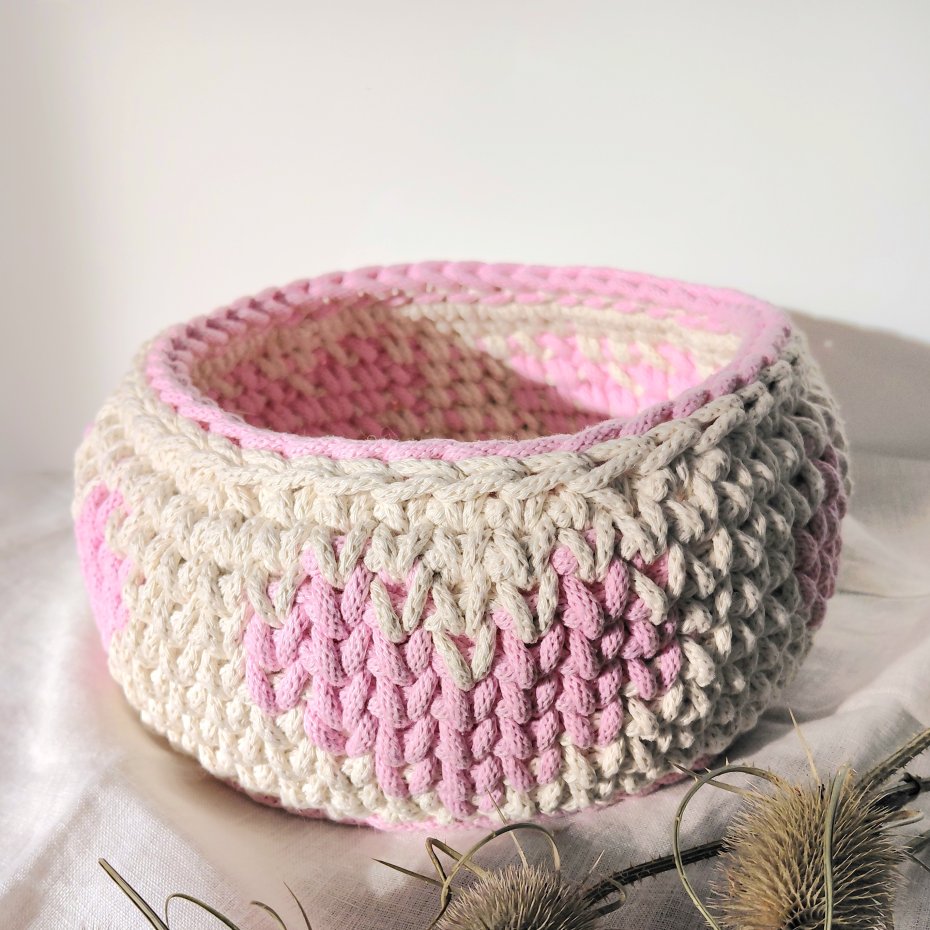 Koszyk średnicy 22/17cm, wysokości 11cm wykonany ręcznie ze 100% bawełnianego sznurka grubości 5mm w kremowym kolorze i ozdobiony różowymi serduszkami.
