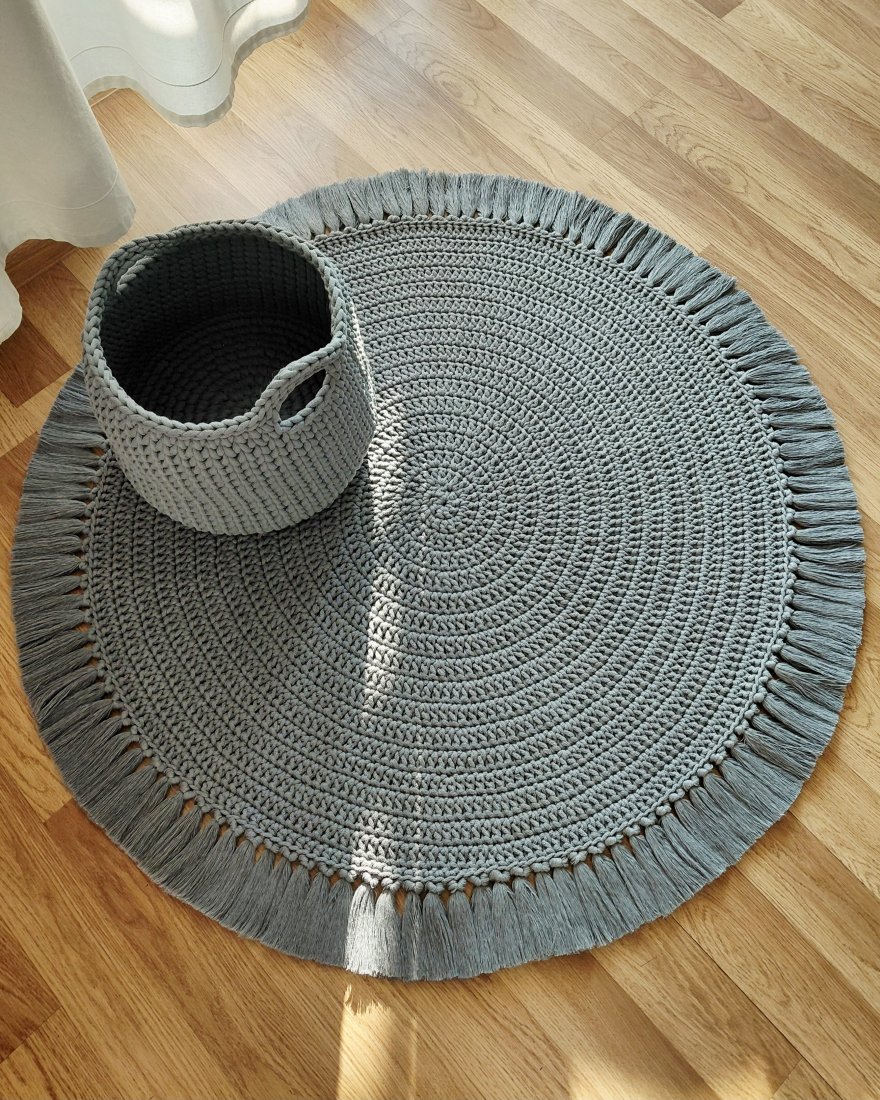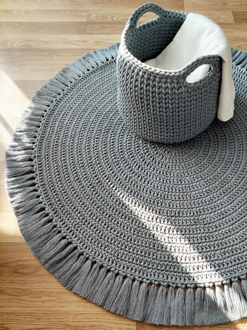 Sznurkowy zestaw w promocyjnej cenie, składający się z dużego kosza średnicy 36cm i wysokości 29cm plus uchwyty i okrągłego dywanu z frędzlami średnicy 115cm wykonane ręcznie szydełkiem z certyfikowanego, bawełnianego sznurka grubości 0,9cm i 0,5cm w stalowym kolorze.