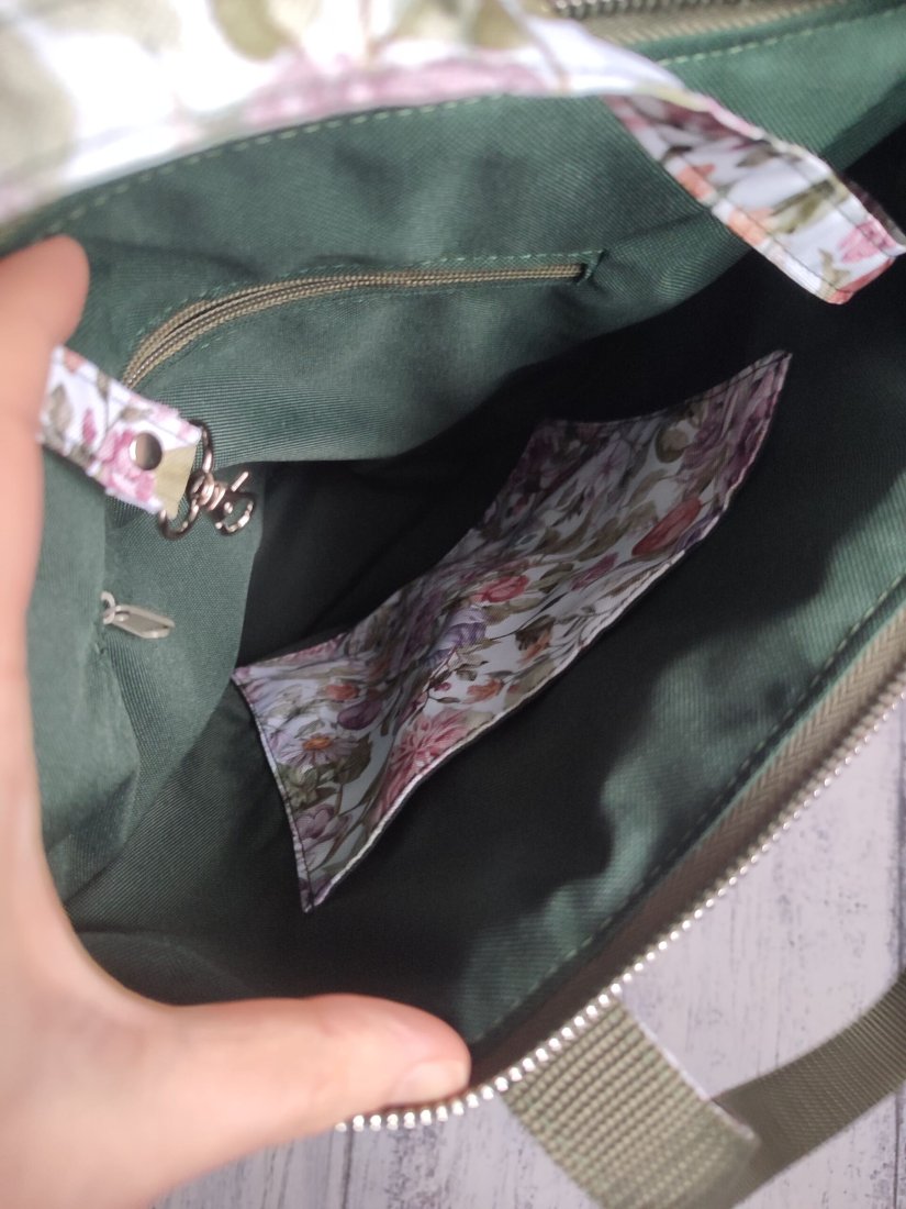 Wnętrze chroni podszewka z zielonej tkaniny wodoodpornej Oxford.
