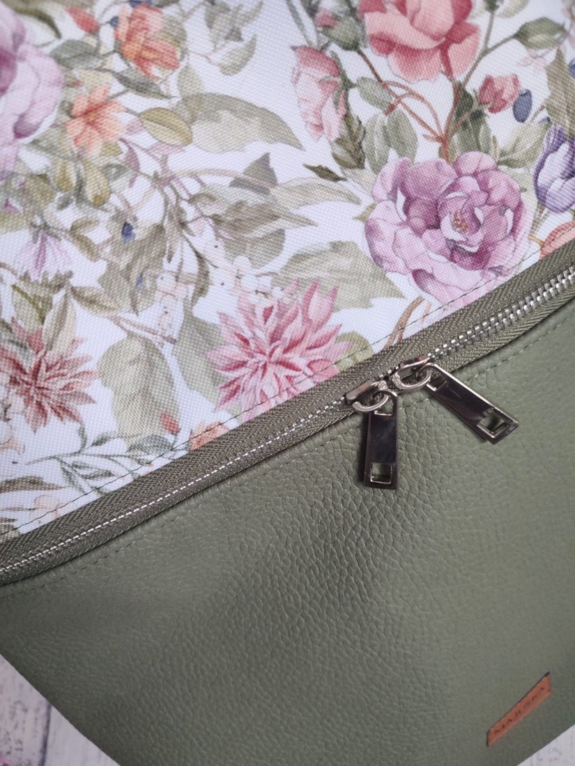 Z przodu torebki obszerna kieszeń na zamek. Wewnątrz kieszonka wsuwana, kieszonka na zamek oraz smyczka na klucze.