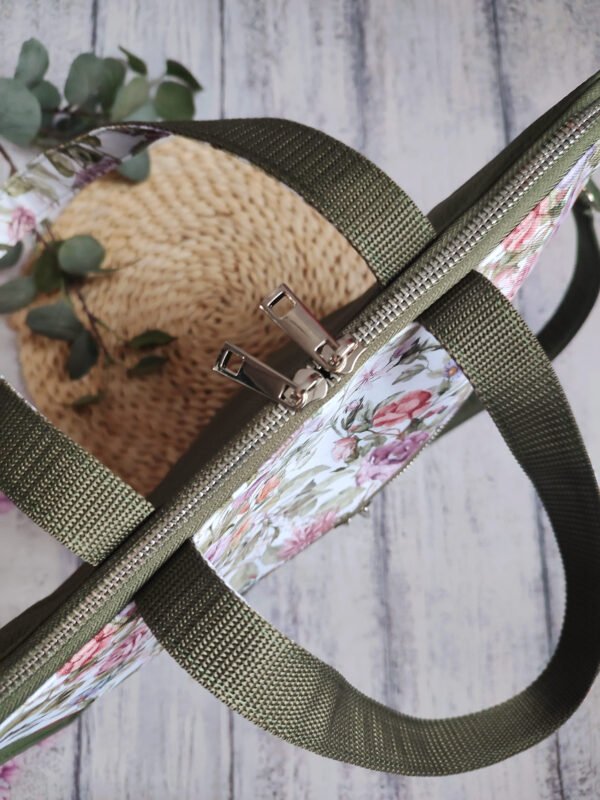 Długie uszy do noszenia na ramieniu, oraz odpinany regulowany pasek do noszenia przez ciało.