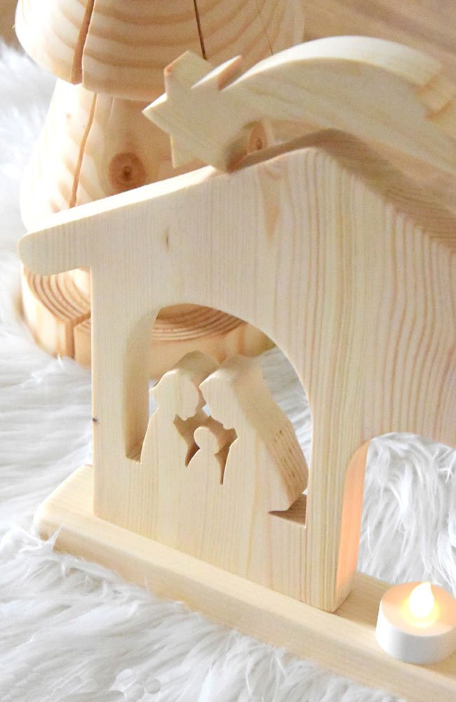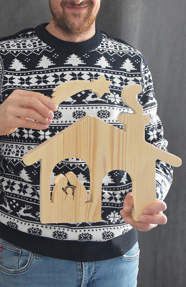Szopka bożonarodzeniowa z współczesną rodziną. Całość wykonana jest z drewna sosnowego. W komplecie gwiazda betlejemska wykonana z tego samego drewna. Podstawkę przykręcamy wkrętami tak aby można byłoby wykorzystać elementy oddzielnie.