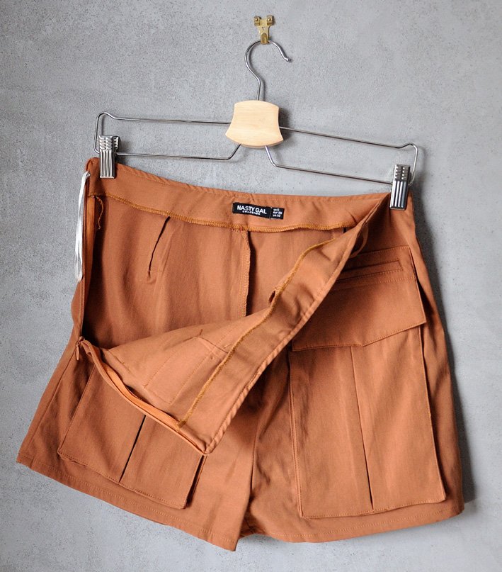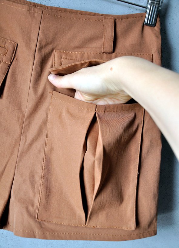 Zapinane z boku na kryty zamek. Z przodu, na biodrach, dwie kieszenie z klapkami cargo. Kieszenie mają dodatkowo wszytą pionowo kontrafałdę - fikuśnie się "rozszerzają".