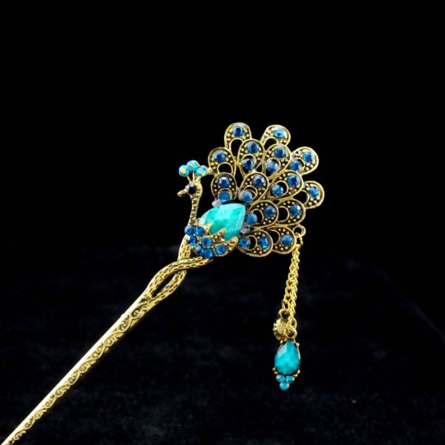 Piękna ozdoba do upiętych włosów. Metalowa szpila w złoto niebieskim kolorze, zdobiona kamieniami z tworzywa i kryształkami.